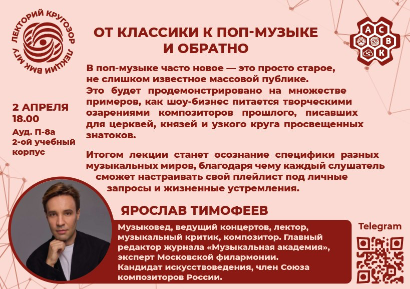 2 апреля в 18:00 в аудитории П-8а (2-й учебный корпус ВМК МГУ) состоится лекция Ярослава Тимофеева — музыковеда, музыкального критика, композитора, ведущего концертов, главного редактора журнала «Музыкальная академия», эксперта Московской филармонии, кандидата искусствоведения, члена Союза композиторов России.